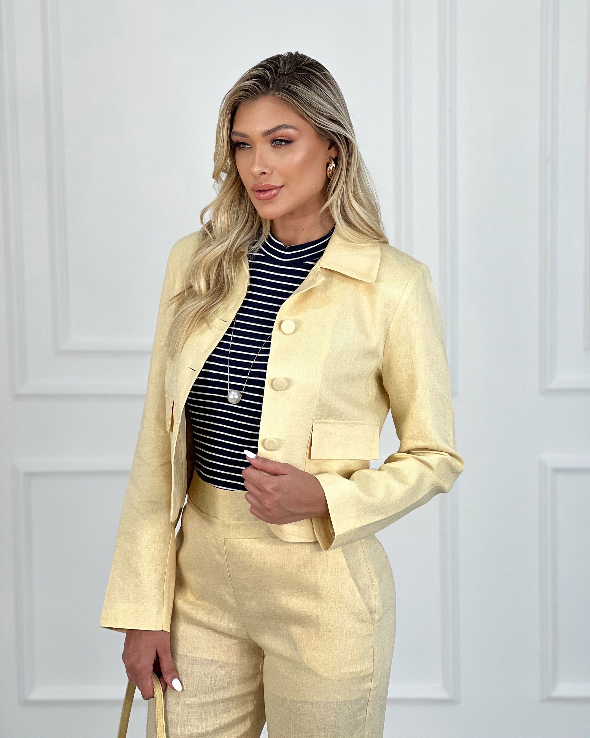 BLAZER LINHO LOUISE é uma peça de roupa sofisticada, versátil e elegante, perfeita para um visual casual e ao mesmo tempo chique para várias ocasiões. Comprimento na cintura, manga longa, fechamento em botões encapados frontal, forro interno, bolsos na barra frontal.