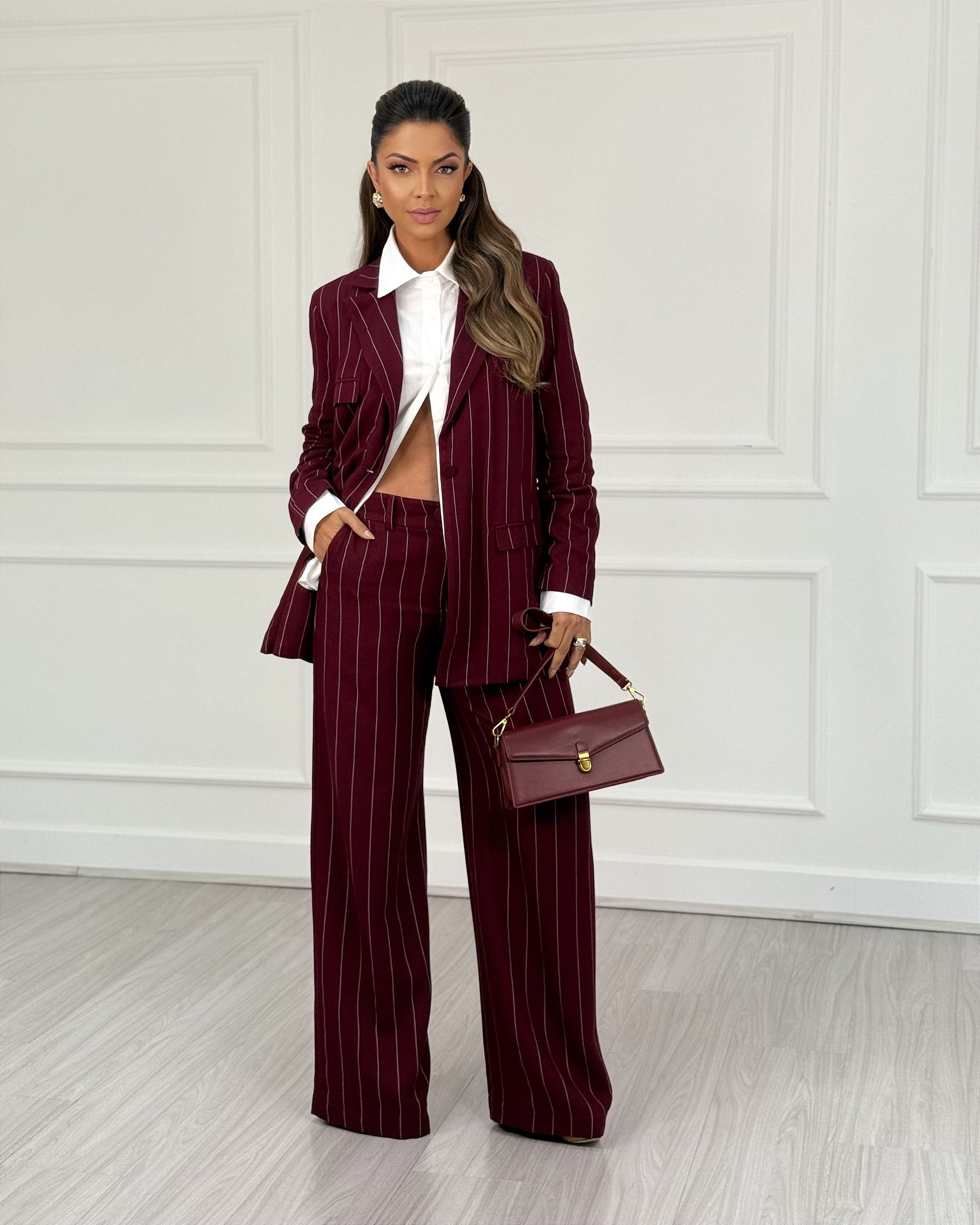 A calça feminina de alfaiataria reta com risca de giz e bolso com lapela é uma peça sofisticada que une elegância clássica e estilo contemporâneo. Com modelagem reta, valoriza a silhueta e proporciona caimento estruturado, trazendo presença e refinamento ao visual.
