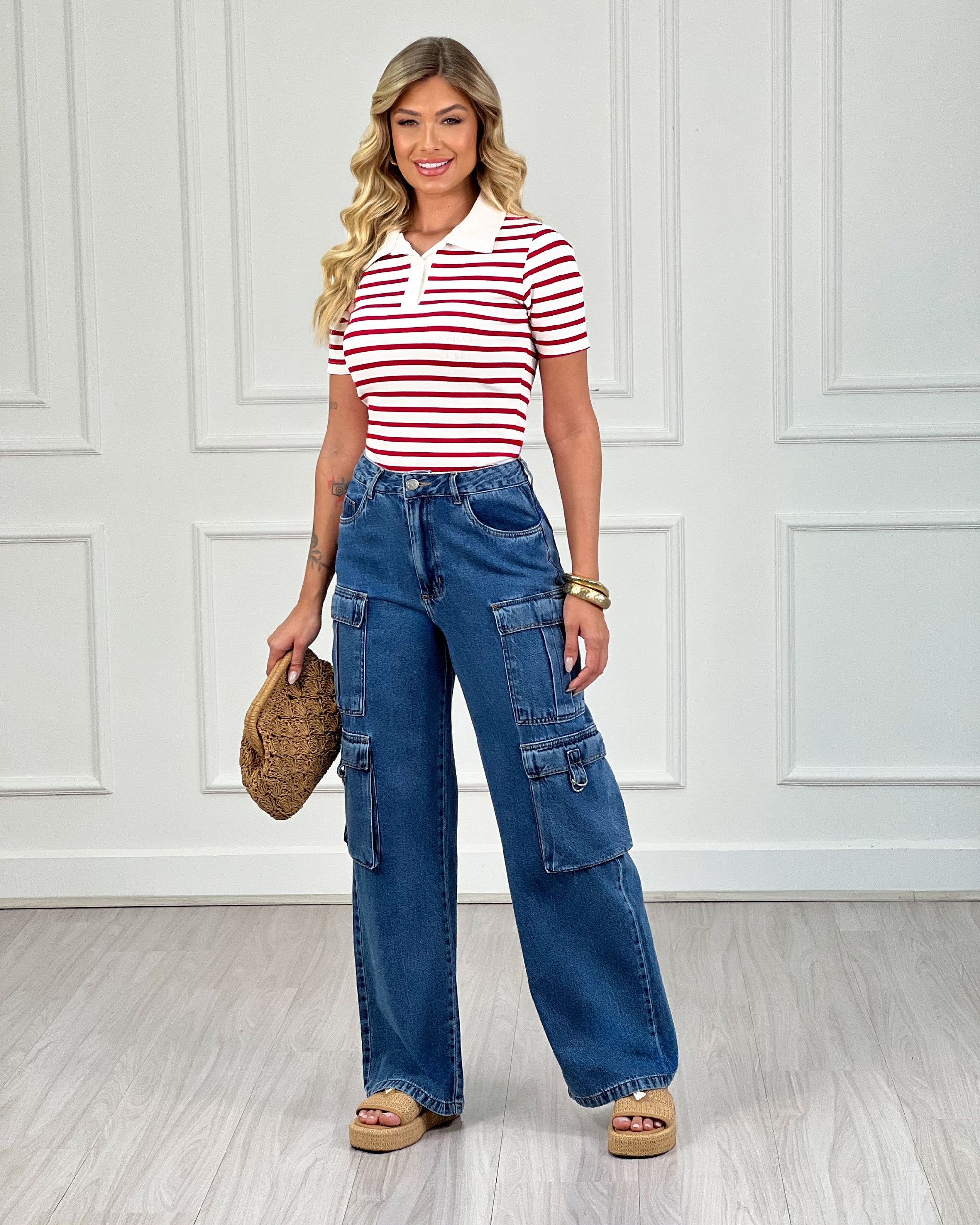 Comprimento alongado, rica em bolsos cargos laterais com alguns detalhes em fivelas pratas, bolsos faca lateral, bolsos posterior, fechamento em zíper e botão frontal, passantes.