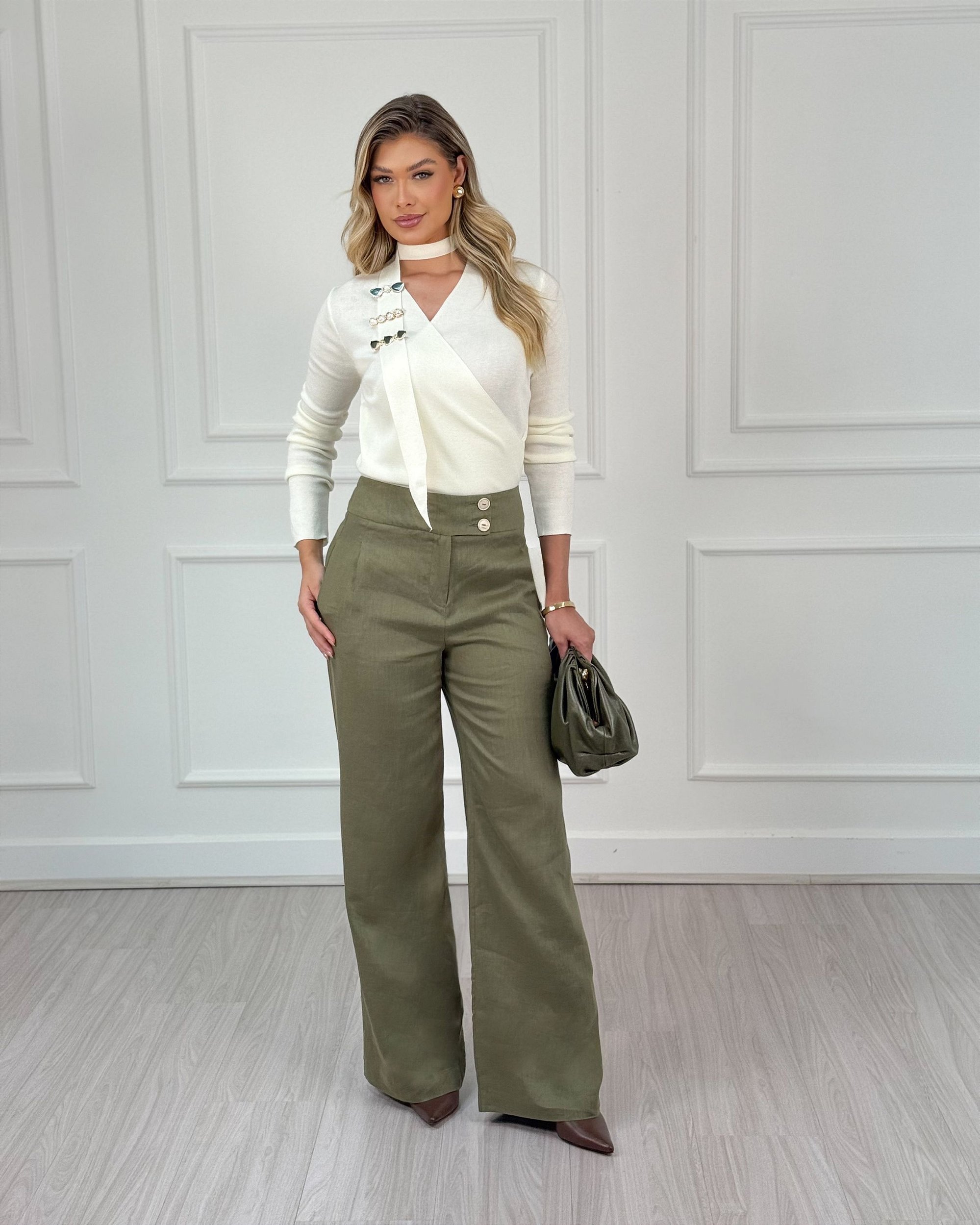 CALÇA LINHO WIDE LEG é uma peça de roupa sofisticada, versátil e elegante, perfeita para um visual casual e ao mesmo tempo chique para várias ocasiões.