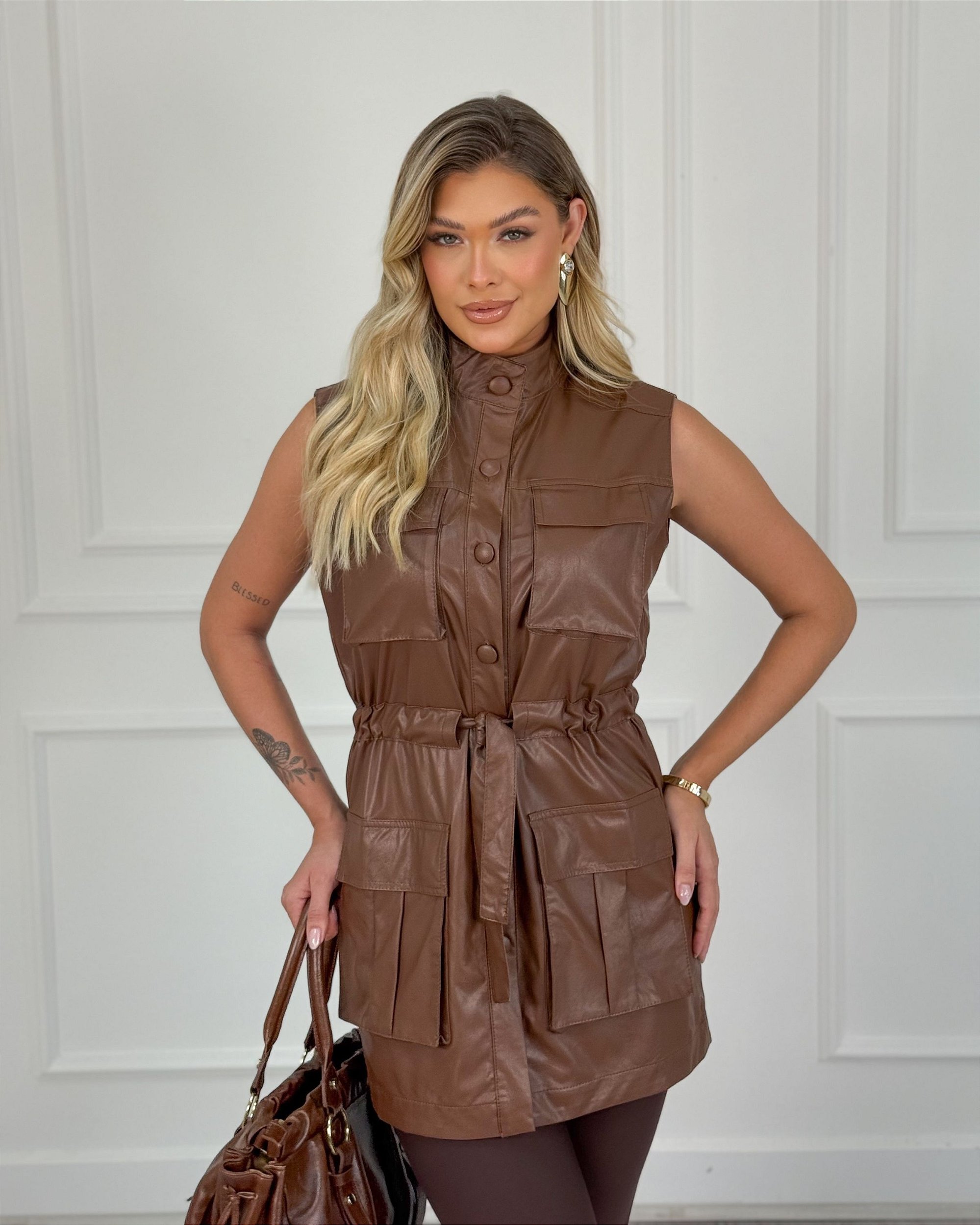 Comprimento alongado, cavado, bolsos frontal, fechamento em botões encapados frontal, regulagem amarração na cintura frontal, couro PU.