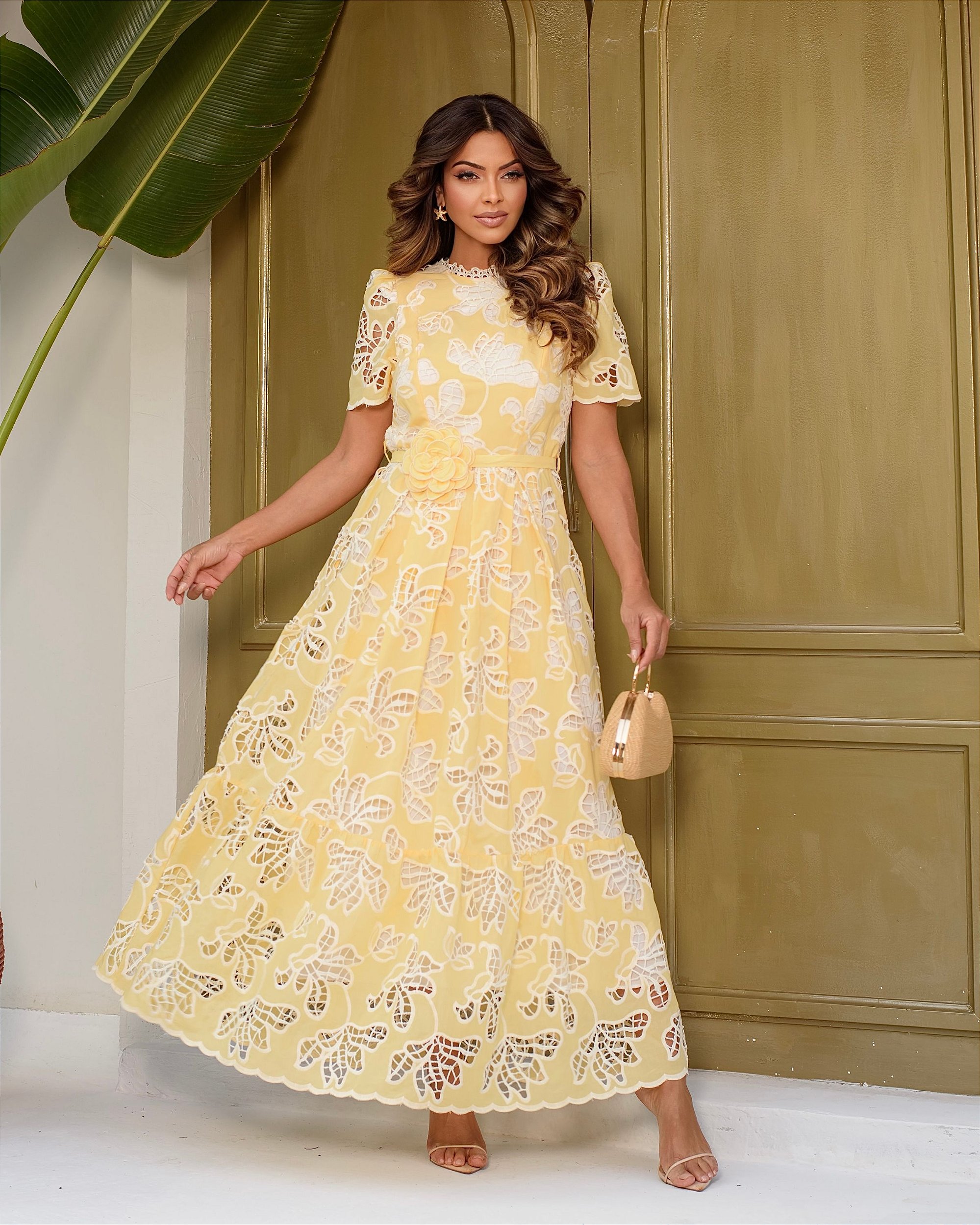 Comprimento alongado, manga curta princesa com recorte nuvem, decote redondo, fechamento em zíper posterior, saia rica em detalhe em pregas e barra possui babado, modelo rico em vazado em bordados, forro interno, cinto faixa com brochê de flor removivél.